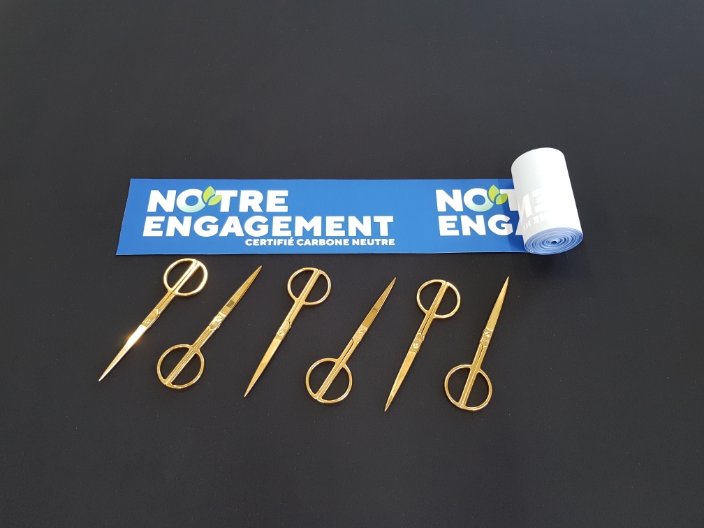 Pour vos évènements, AVS Communication réalise des kits inauguraux imprimés et entièrement personnalisables selon vos goûts et envies. Ici, un ruban et 4 paires de ciseaux dorées. Vous pouvez également ajouter un coussin, une boîte de rangement, une housse pour les ciseaux… Demande de devis pour estimation du montant.