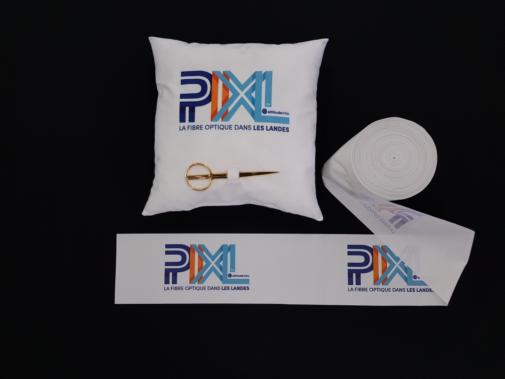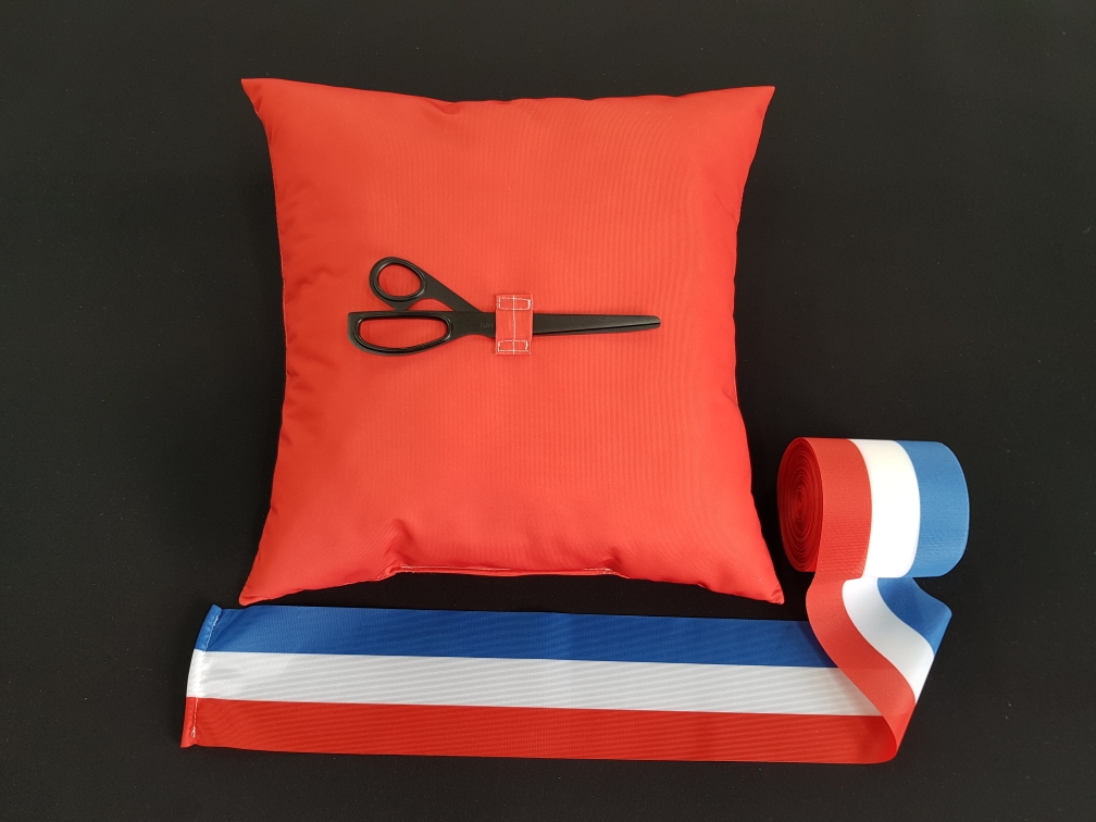 Expert en impression de matériel pour inaugurations, notre entreprise réalise pour vous tous vos projets sur-mesure. Ici, nous avons imprimé un ruban tricolore mais aussi un coussin inaugural. Nous fournissons aussi les ciseaux pour inauguration qu’ils soient DORE, ARGENTES, ou comme ici en acier laqué NOIR. Prix et délai sur simple demande.