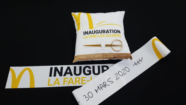 Expert en signalétique, basé à Dijon, notre société fabrique et expédie partout en France des éléments visuels pour inaugurations. Ici un ruban inaugural pour Marseille réalisé en tissu imprimé, coupé à chaud, d’une hauteur de 100mm.