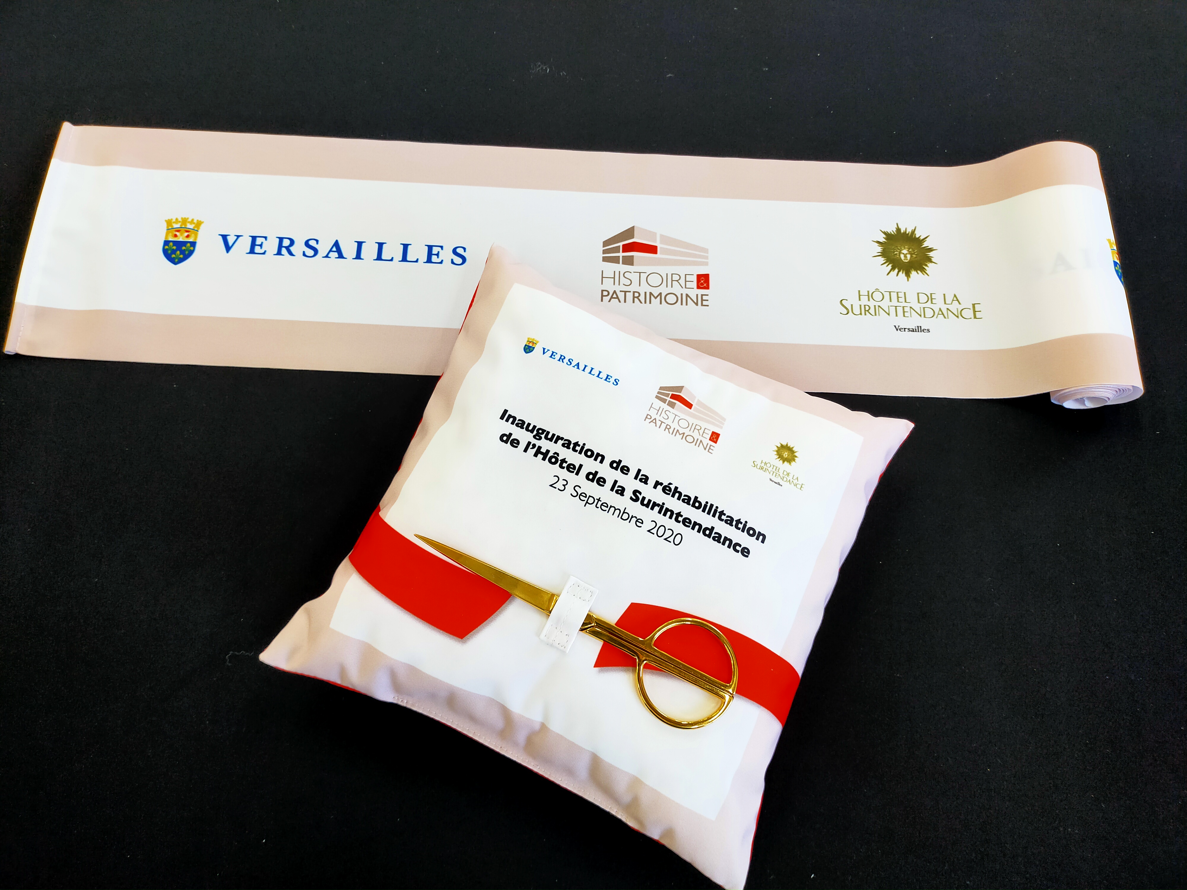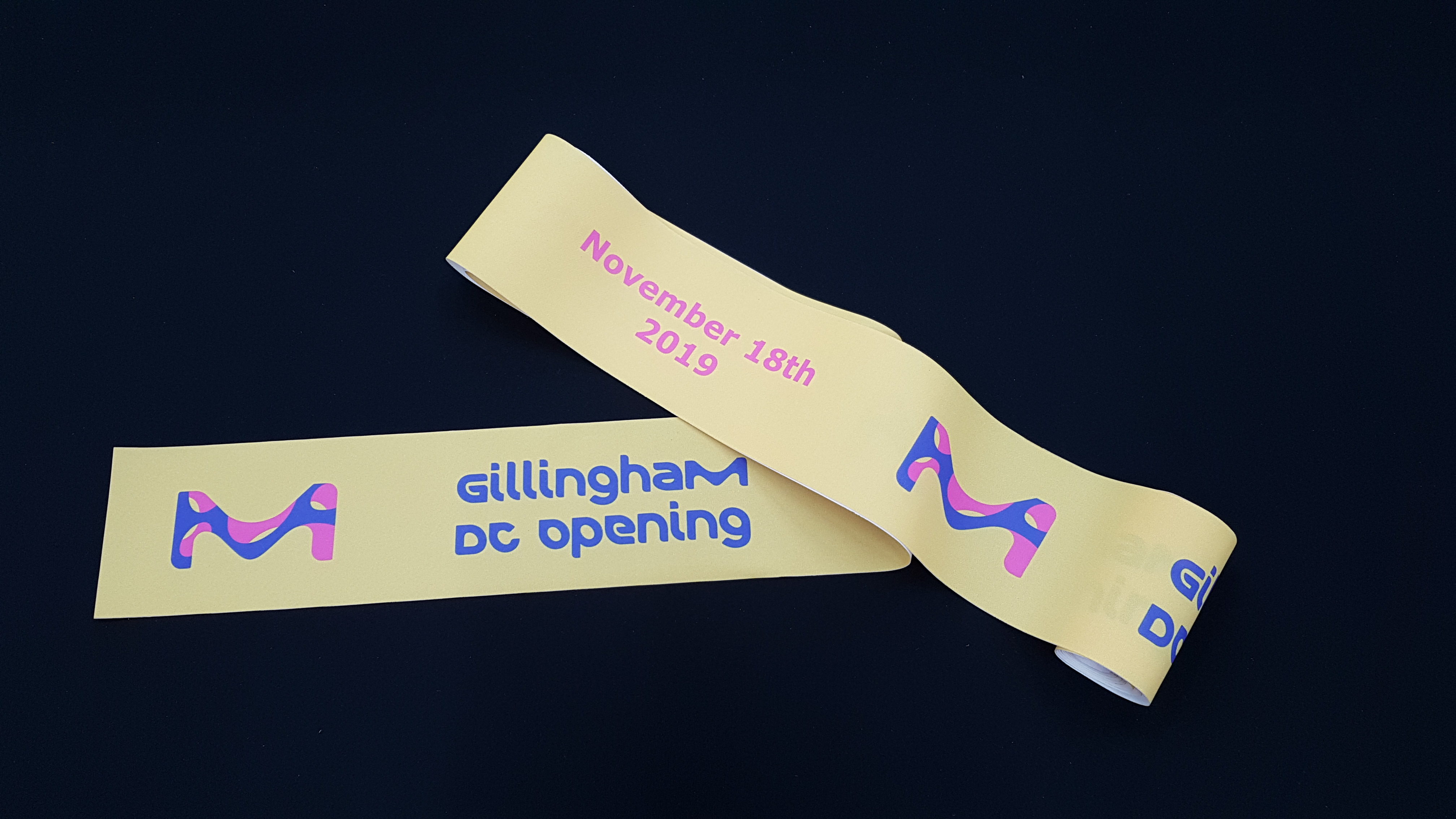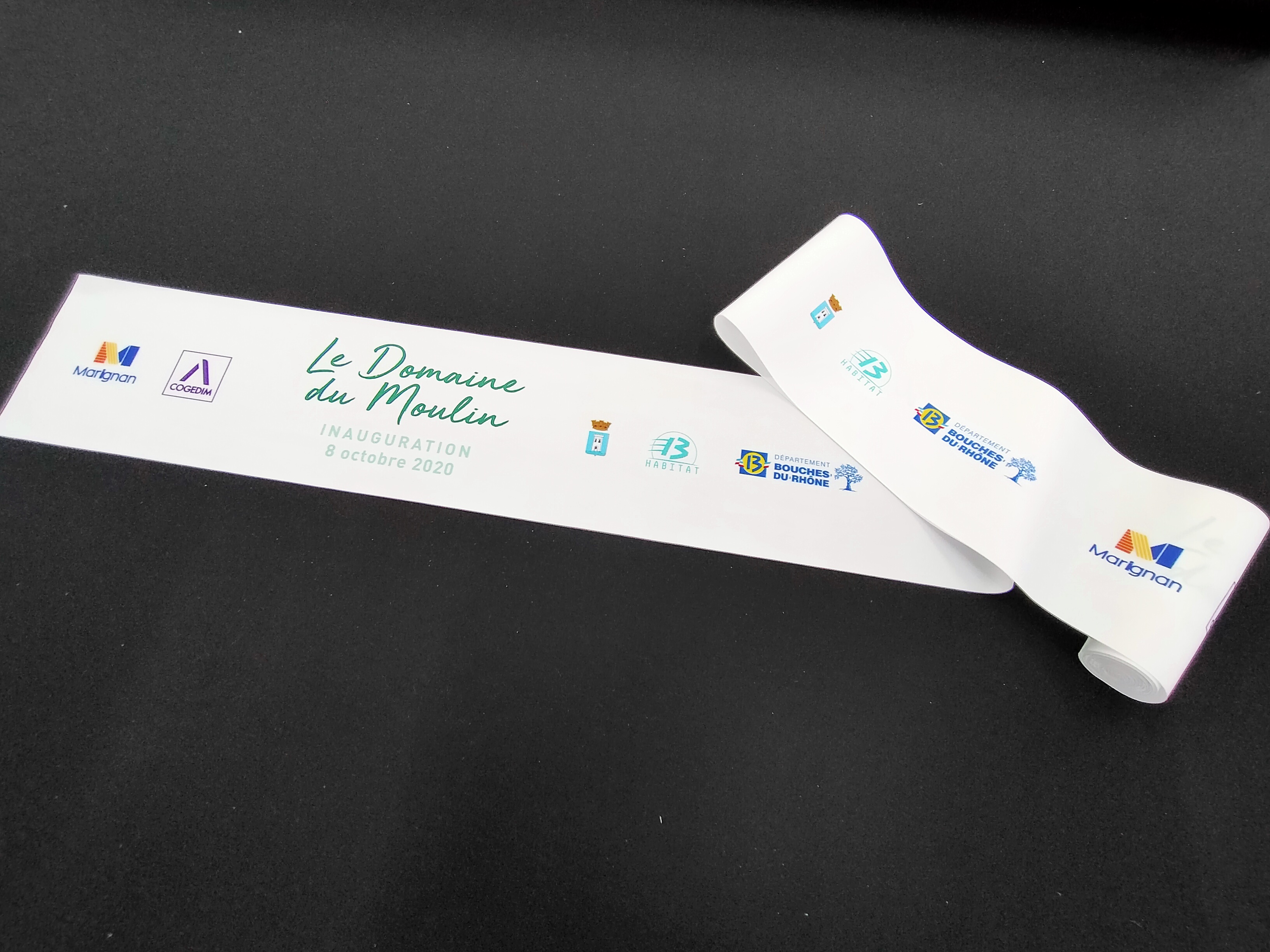 Expert en signalétique, basé à Dijon, notre société fabrique et expédie partout en France des éléments visuels pour inaugurations. Ici un ruban inaugural pour Marseille réalisé en tissu imprimé, coupé à chaud, d’une hauteur de 100mm.