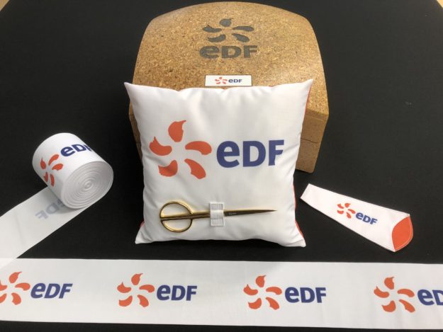 AVS Communication, spécialiste en impression tissu, propose des rubans personnalisable à votre image. Choisissez un ruban inaugural pouvant être complété par des accessoires tels qu’une ou plusieurs paires de ciseaux (OR, Argent), un potelet, un coussin ainsi qu’une caisse en bois recyclé. Le client a la possibilité de choisir la taille et le visuel de son