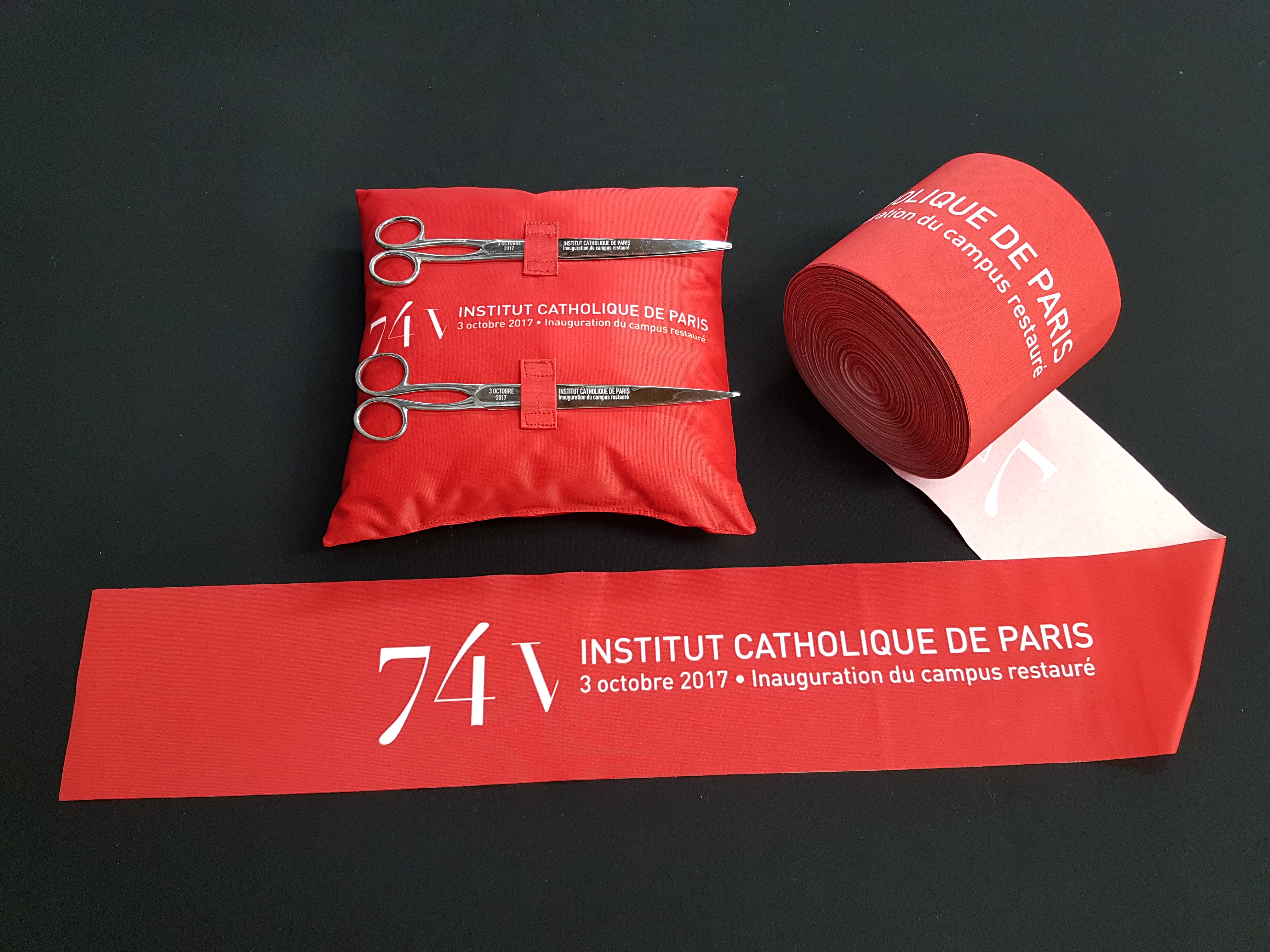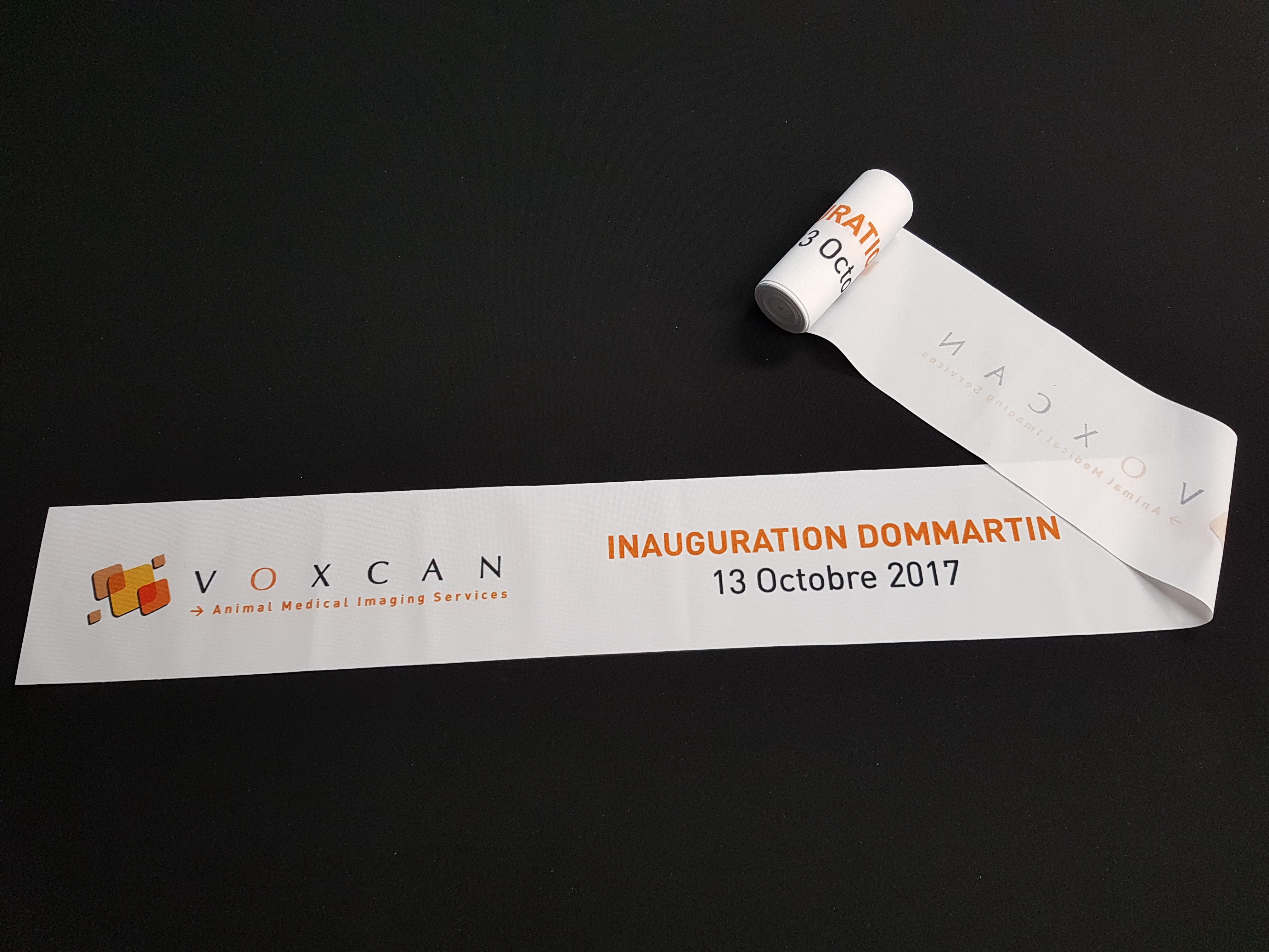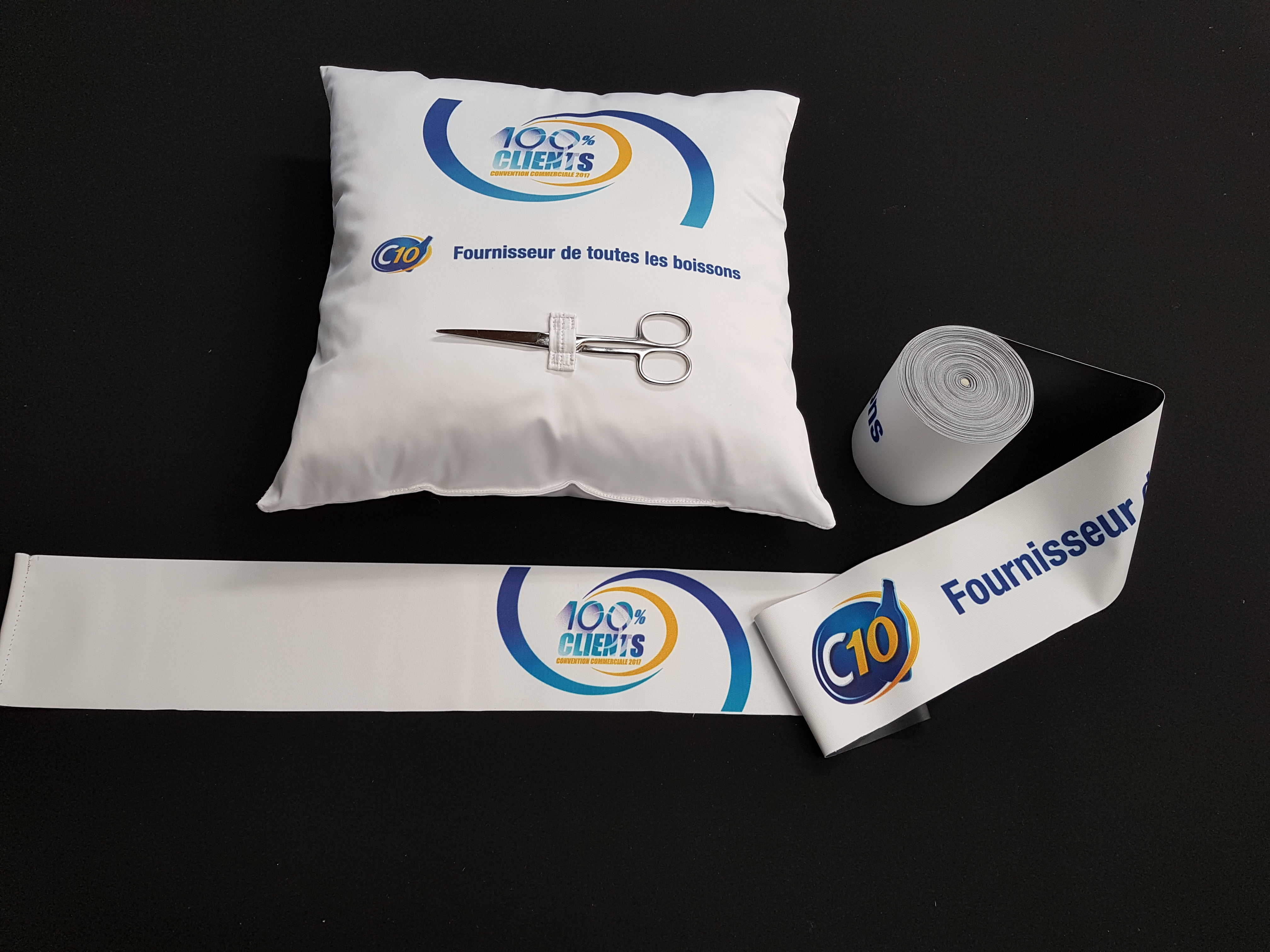 AVS Communication, spécialiste en impression tissu, propose des rubans personnalisable à votre image. Choisissez un ruban inaugural pouvant être complété par des accessoires tels qu’une ou plusieurs paires de ciseaux (OR, Argent), un potelet, un coussin ainsi qu’une caisse en bois recyclé. Le client a la possibilité de choisir la taille et le visuel de son