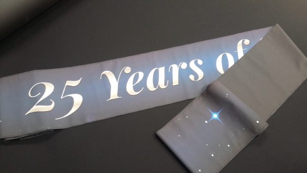AVS Communication, expert en impression tissu, propose de personnaliser à vos couleurs rubans et accessoires pour vos événements. Ici, un ruban imprimé recto/verso, à l’occasion d’un anniversaire. Prix et délai sur simple demande.