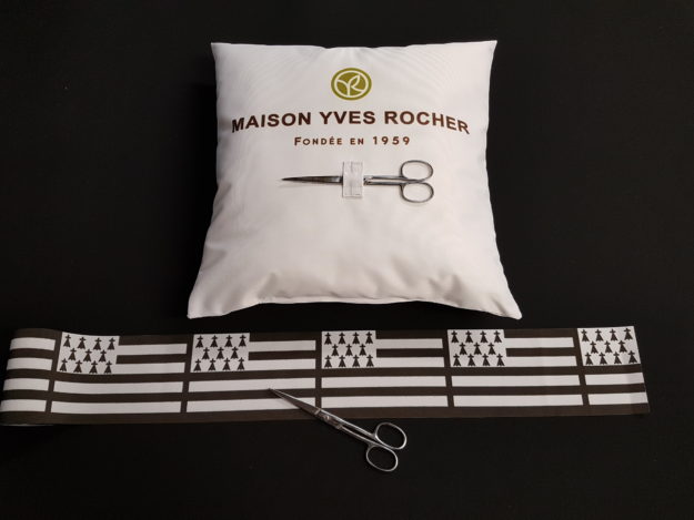 AVS Communication, expert en impression sur tissu, vous propose de personnaliser vos événements avec des accessoires personnalisés. Choisissez un kit selon vos besoins. Ici, un coussin et un ruban avec le logo imprimé, et une paire de ciseaux pouvant être gravée. Prix et délai sur simple demande.