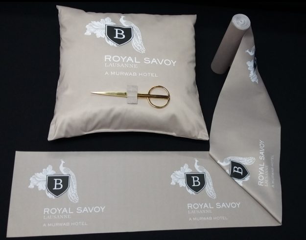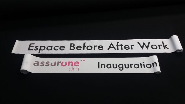 Notre atelier propose du ruban inaugural imprimé à vos couleurs. Ici un lot de deux rubans réalisés aux couleurs de la société « Assurone ». L’ensemble est réalisé sur-mesure d’après un fichier fourni ou une maquette de notre graphiste. Prix et délais sur simple demande.