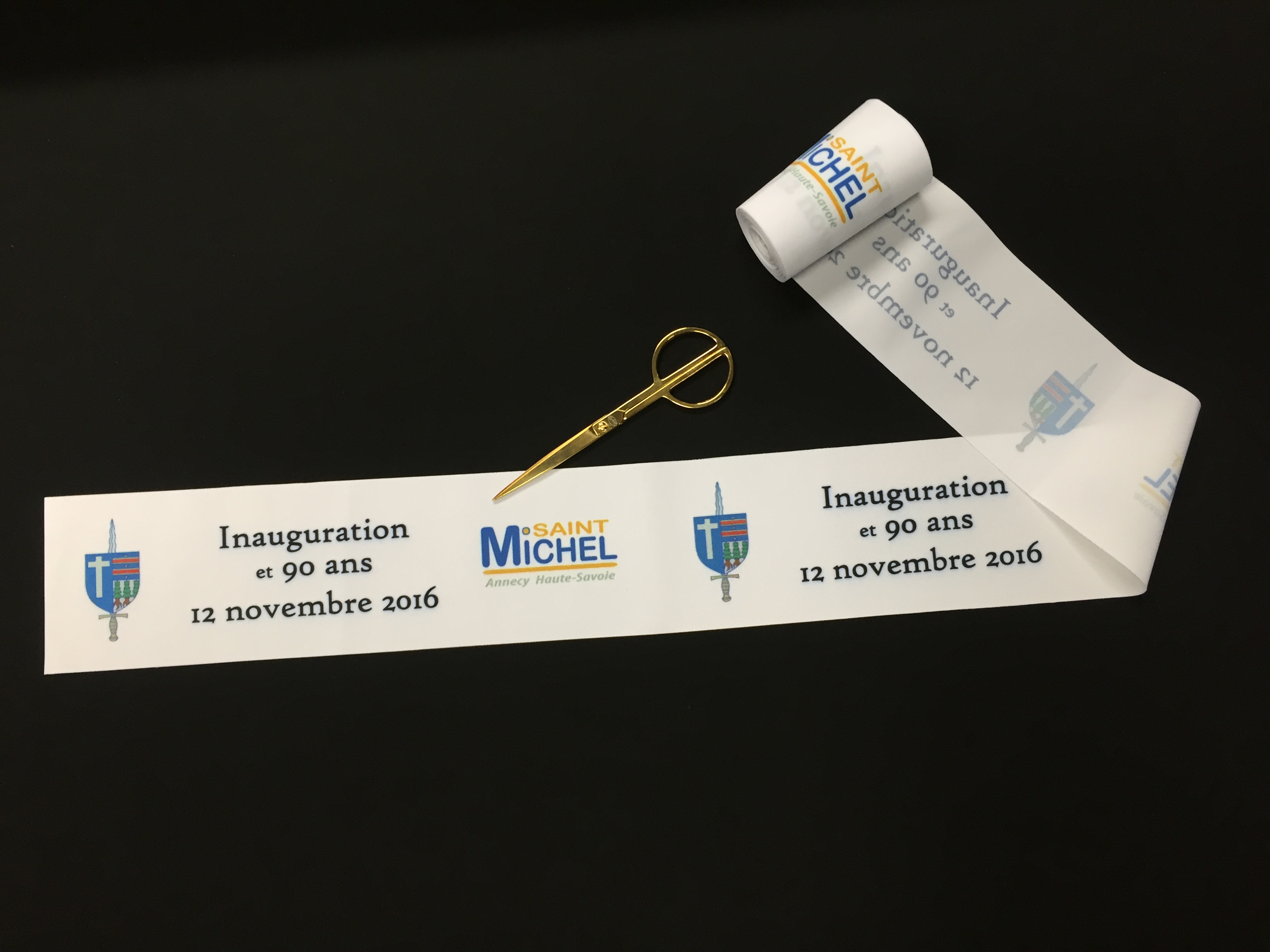 Notre atelier propose du ruban inaugural imprimé à vos couleurs. Ici un lot de deux rubans réalisés aux couleurs de la société « Assurone ». L’ensemble est réalisé sur-mesure d’après un fichier fourni ou une maquette de notre graphiste. Prix et délais sur simple demande.