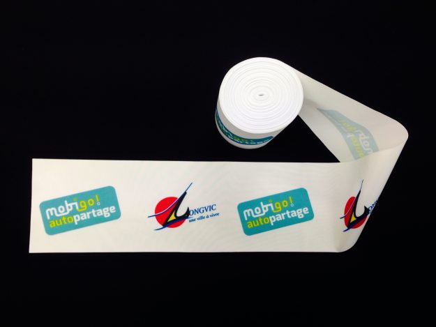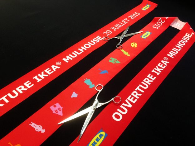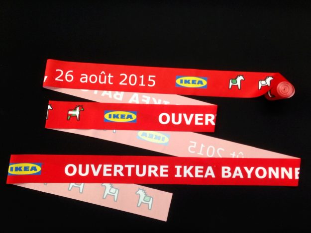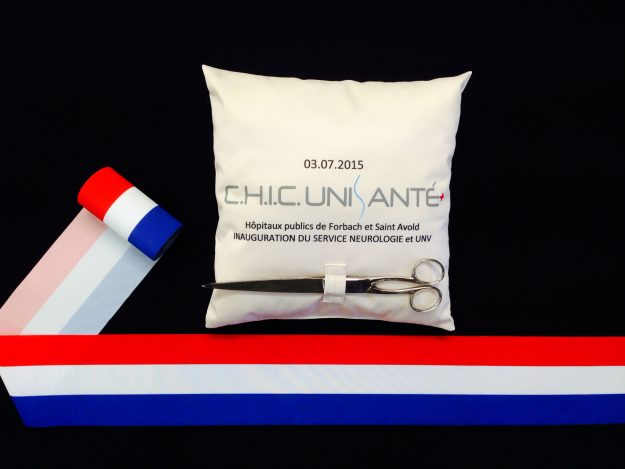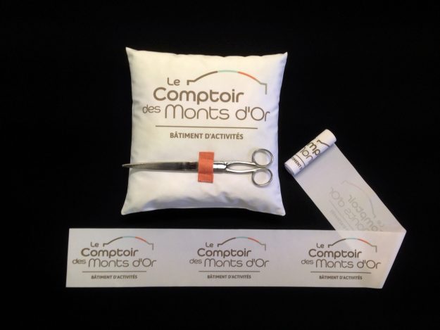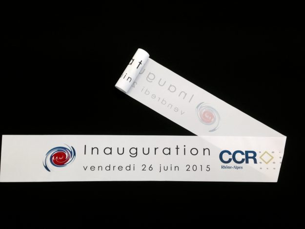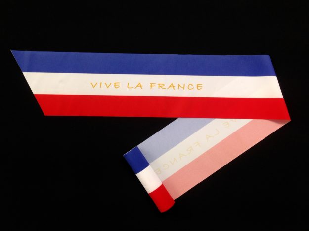 Expert en impression de ruban inaugural en France, AVS Communication réalise pour vous des projets sur-mesure. Ici, un ruban aux couleurs du drapeau français avec un texte demandé par notre client. Les bords sont coupés à chaud et les côtés sont coupés en biais selon la demande précise de notre client. Largeur de 30 à