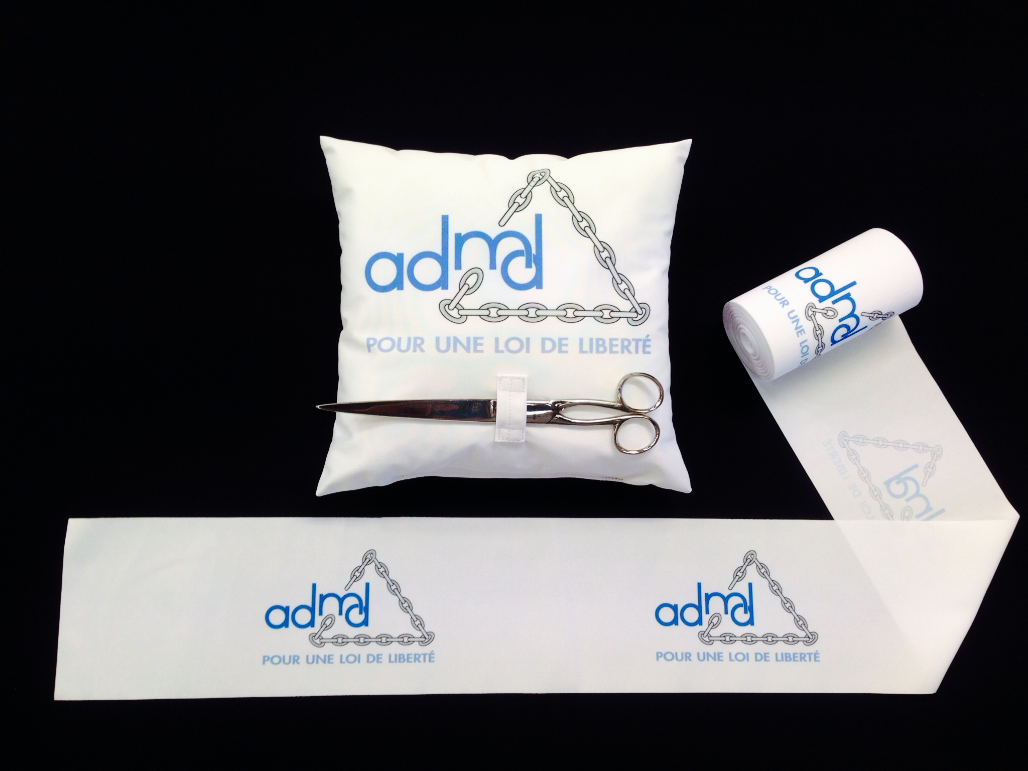 Expert en impression de ruban inaugural en France, AVS Communication réalise pour vous des projets sur-mesure. Ici, un ruban aux couleurs du drapeau français avec un texte demandé par notre client. Les bords sont coupés à chaud et les côtés sont coupés en biais selon la demande précise de notre client. Largeur de 30 à