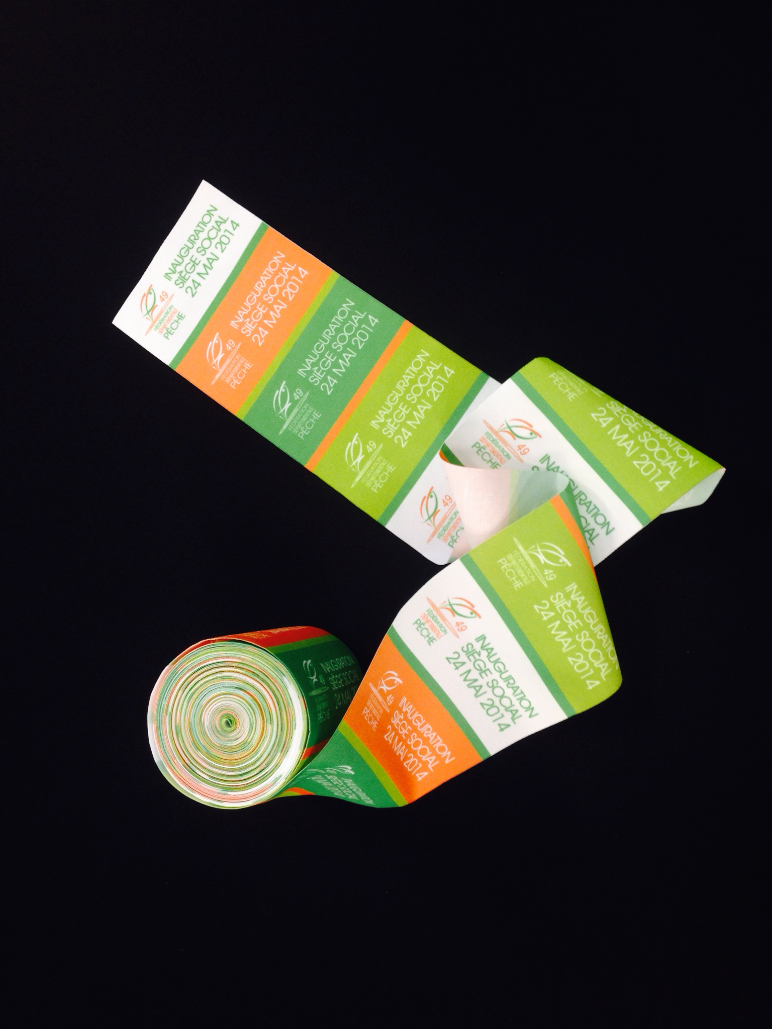 Pour vos événements, notre atelier réalise dans son atelier de Dijon du ruban inaugural imprimé à vos couleurs. Sur une base de tissu blanc, nous imprimons les formes, textes, logos et couleurs de votre choix. Ce ruban inaugural fourni en rouleau est de taille variable jusqu’à 180mm de large et sans limite de longueur. Plus