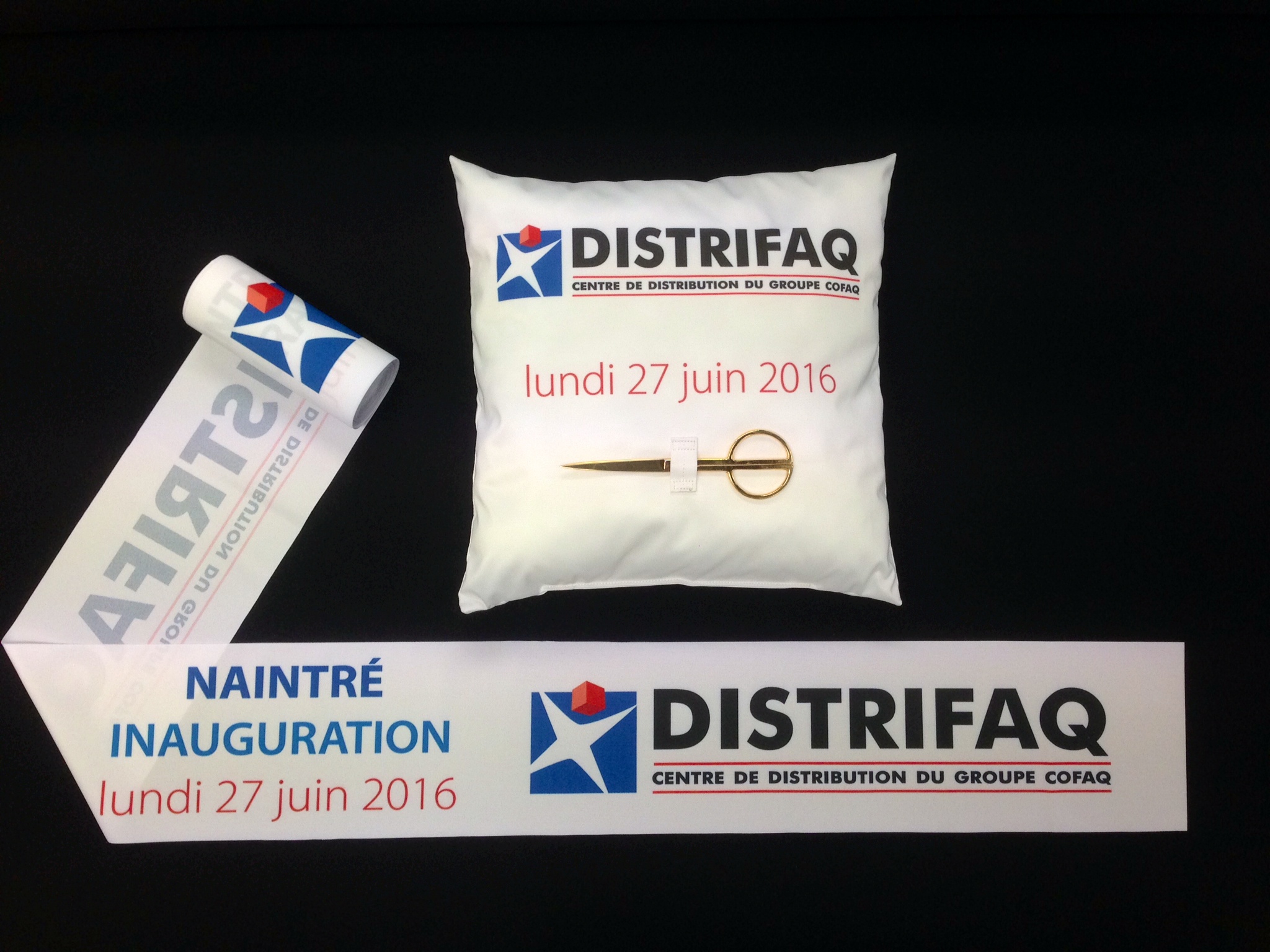 Ici, Distrifaq a fait appel à nous pour fabriquer un kit inaugural comprenant un coussin, un ruban imprimé avec leur logo et une paire de ciseaux Or (18,5 cm).